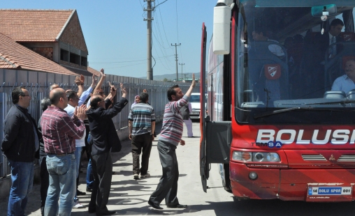 Ligde oynadığı son maçlarda aldığı başarısız sonuçlarla Play-off şansını zora sokan Boluspor, bitimine üç hafta kala deplasmanda oynadığı Karşıyaka maçı için İzmir'e hareket etti. Sabah saatlerinde Bolu'daki son idmanını yapan kırmızı beyazlı takım, öğle saatlerinde karayoluyla Ankara'ya gitti. Kafileyi tesislerden yöneticiler Hakan Dizman, Nadi Okur, Feridun Yılmaz ve tesis çalışanları uğurladı. Takımda sakatlıkları bulunan golcü oyuncu Veysel'in yanı sıra Orhan, Gencer ve Eser, 18 kişilik kadroda yer almadılar. Geçtiğimiz hafta Fas'a giden ve Denizlispor karşılaşmasında takımın yanında yer alamayan Başkan Necip Çarıkçı ise kafileyle birlikte yola çıktı. Kırmızı beyazlı takım karayoluyla Ankara'ya, oradan da uçakla İzmir'e gidecek. Boluspor, akşam saatlerinde yaptığı ter idmanının ardından kampa girdi.