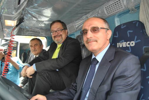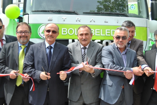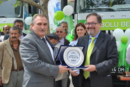 Efe Endüstri Satış Müdürü Yeğencik’in ardından İveco Araç Sanayi AŞ Yönetim Kurulu Üyesi Maurizio Manera’da, “Burada ki program çok önemli çünkü Türkiye’de ilk defa bir belediyeye doğalgazlı çöp toplama aracı teslim ediyoruz. Bu gün İveco’nun ürettiği 11 bin araç dünyanın 70’den fazla şehrinde kullanılmaktadır. Bu şekilde de Bolu ili Türkiye’de ilk defa doğalgazlı çöp aracı kullanarak dünyada ki 70 şehre katılmış oluyor. İnanıyorum ki Türkiye’de ki diğer belediyelerde Bolu Belediyesi’ni örnek alarak bu araçları filolarına katacaklardır. Ama her zaman birinin çıkıp ilk adımı atması gerekiyor. Bu cesareti gösteren Belediye Başkanı Alaaddin Yılmaz’ı kutluyor, çalışmalarında başarılar diliyorum” dedi. Manera konuşmasın ardından Belediye Başkanı Alaaddin Yılmaz'a üzerinde İveco 2012 teslimatı yazılı bir plaket takdim ederek çalışmalarında başarılar diledi.