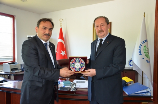 Coşkun, Erata’ya üzerinde AİBÜ logosu bulunan çini tabak hediye etti.
