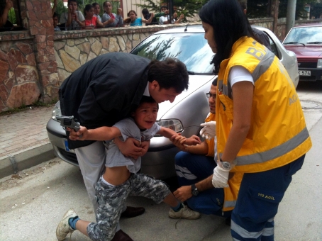 112 Acil Servis ekibi, hastaneye gitmemek için direnen küçük çocuğu yaptığı kontrolün ardından ambulansla evine götürdü. Olay, Sağlık Mahallesi'nde meydana geldi. Bolu İl Emniyet Müdürlüğü'nün önünde kaldırımda bisiklete binen Sercan Kocabaş, dengesini kaybederek düştü. Sercan Kocabaş'ın yere düştüğünü gören polisler, yardıma koştu. Polisleri gören küçük çocuk, korkudan ağlamaya başladı. Sercan Kocabaş, elindeki oyuncak tabancayı polislere doğrultup ateş ederek, "Gelmeyin, annemi istiyorum. Siz gelmeyin" diyerek bağırdı. Vücudunda ezikler oluşan Sercan Kocabaş'ı sakinleştiren polisler, 112 Acil Servis'ten yardım istedi. Sercan Kocabaş, hastaneye gitmek istemediğini söyleyerek polislerin elinden kaçmaya çalıştı. Sercan Kocabaş'ı kucaklayan bir polis memuru, olay yerine gelen 112 Acil Servis ambulansına götürdü. 112 ekiplerini gören Sercan Kocabaş, "Ambulansa bindirmeyin, hastaneye gitmeyeceğim. Annemi getirin. Ne yapacaksanız burada yapın. Annemi çağırın" diyerek ağladı.112 Acil Servis görevlisi, "Sercan beni dinler misin? Sana bir şey yapmayacağız. Sakin ol. Bak elimde hiçbir şey yok" dedi. Ağlamaya devam eden Sercan Kocabaş, "Tamam o zaman burada yapın. Benim hiçbir şeyim yok" diye konuştu. 112 Acil Servis ekibi, polis memurunun kollarından tutarak sakinleştirmeye çalıştığı Sercan Kocabaş'ın vücudunu kontrol etti. Bu sırada gelen Sercan Kocabaş'ın ağabeyi 10 yaşındaki Serdar Kocabaş da kardeşini sakinleştirmeye çalıştı. 112 Acil Servis ekibi yapılan kontrolün ardından Sercan Kocabaş ve ağabeyini ambulansla evine götürdü.