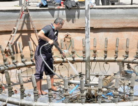 Son olarak Bolu Belediyesi önündeki süs havuzunu temizleyen ekipler, havuzun dibine yapışan yosunları tanzikli suyla çıkarıyor.