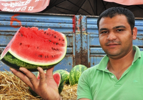 Bu yıl karpuzların bir hayli büyük olmasına dikkat çeken sebze ve meyve hali çalışanları, bahar aylarının bol yağışlı geçmesinin kendilerini mutlu ettiğini belirttiler.