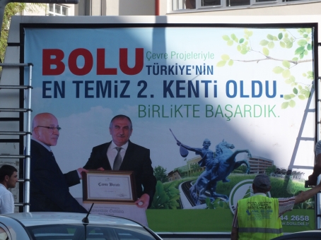 Çevre ve Şehircilik Bakanlığı’nın düzenlediği yarışmada Çevre Bakanlığı kriterlerine göre çevre ile ilgili proje dalında Bolu en temiz 2. il olarak seçildi. Bunu seçilmesinde etken diğer bir çok ile göre Bolu’nun çevresel atık, evsel atık, temiz su, pis su arıtması, katı atık istasyonları gibi birçok yapıyla diğer illere nazaran tesisleşme yönünden önde olmasıydı. Geçtiğimiz günlerde şehir merkezindeki billboardlara Belediye Başkan’ı Alaaddin Yılmaz’ında resminin bulunduğu bu konuyla ilgili afişler asılmıştı. Billboardların çevresinde bulduğumuz vatandaşlar bu konuda dertlerini dile getirdiler. Yaptıkları açıklamalarda;“ Çevre Bakanlığının verdiği ödül kendi kriterlerine göre doğru olabilir. Bu işin bir de Bolu halkı boyutu vardır. Halkın algısına bakılması gerekir. Bolu’da insanlar hala çukurlarda mücadele ediyorsa, yazın bir saat sulanarak çamur, sonra da toz içinde evine ve iş yerine gidiyorsa alınan ödülü ‘Bolu hak etti’ denemeyecektir. Billboard’lara koyulan afiş hakkında ise vatandaşlar “Burada yapılması gereken çevre ile ilgili Bolu’nun değil ikinci, birinci il olması için Bolu halkının bu ödülü vermesi lazım. Bu ödülü vermesi için önümüzdeki yılların Bolu’su değil, bugün yaşanan Bolu’ya bakarak bu ödülün verilmesi gerekir. Yollar bu durumdayken billboardlara boy boy reklamların asılmasını doğru bulmuyoruz. Bizim temennimiz bu gerçekten hak edilmiş bir ödülse belediyemiz ve belediye başkanımız bir an önce bu sıcak havaları da değerlendirerek üst yapı, kaldırım ve yollarla ilgili yapılması gerekenlerin bir an evvel yapılmasıdır.’’şeklinde şikâyetlerini belirttiler.