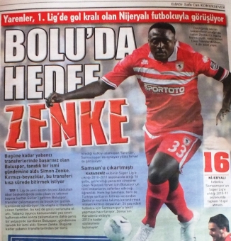 AMK Gazetesi’nin dün yayınlanan sayısında Simon Zenke ile Boluspor Kulüp Başkanı Abdullah Abat’ın yakından ilgilendiği iddia edildi. Haberde, Boluspor’un yabancı transferinde başarısız olduktan sonra Serhat Güller’in gelişi ve yabancı transferde yaş sınırının kalkmasıyla yıldız oyuncuyla görüşmelerin başladığı bildirildi. Zimon Zenke için Boluspor Kulübü’nün tüm imkanlarının seferber edeceği, hem ligi tanıması, hem de Türkiye şartlarını bilmesi nedeniyle bu oyuncuyla görüşmelerin sürdüğü kaydedildi. Diğer yandan 2013 yılına kadar Samsunspor ile sözleşmesi bulunan Zenke’nin kulübü mahkemeye vererek takımdan ayrıldığı yönünde çıkan haberler golcü futbolcunun Boluspor yolunda olduğu haberini destekledi. Nijeryalı golcü 2010-2011 sezonunda Samsunspor’un Süper Lig’e yükseldiği sezonda 16 gol imza atmıştı. Konuyla ilgili olarak yönetimden herhangibir açıklama yapılmadı.
