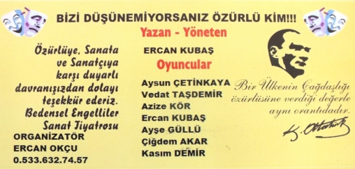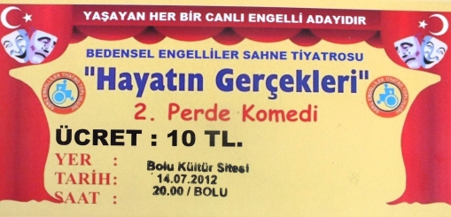 “Hayatın Gerçekleri” adını taşıyan 2 perdelik komedi oyunu 14 Temmuz Cumartesi günü saat 20.00’de Bolu Kültür Sitesi’nde sahnelenecek. Biletlerin 10 TL.dan satıldığı oyununun yazarlığını ve yönetmenliğini Ercan Kubaş yaparken, oyunda Aysun Çetinkaya, Vedat Taşdemir, Azize Kör, Ercan Kulbay, Ayşe Güllü, Çiğdem Akar ve Kasım Demir rol alıyor. Oyunla ilgili bir bilgi veren Organizatör Ercan Okçu şunları söyledi: “Bizi düşünmüyorsanız engelli kim? Yaşayan her canlı bir engelli adayıdır. Özürlüye, sanata, sanatçıya karşı duyarlı davranışınızdan dolayı teşekkür ederiz.”