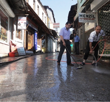 Paçalarını yarı dizlerine kadar sıvayarak, yola inen esnaf; uzattıkları metrelerce hortumun yardımı ile ulaşılması zor yerlere kadar giderek, yolları adeta pırıl pırıl yapıyor.