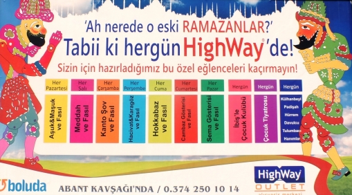 Bolu Dağı Highway Outlet AVM bu yıl çok renkli bir Ramazan programı hazırladı. Alınan bilgiye göre Ramazan ayı boyunca Highway’de birbirinden renkli programlar var. İşte bu müthiş Ramazan programı şu şekilde gerçekleşecek: