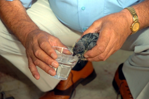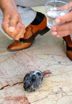 Bolu'da, aşırı sıcaktan etkilenen karga yavrusu, bir işyerinin kapısının önüne düştü. Bardağa su koyan vatandaşlar, kargaya su içirdikten sonra serinlemesi için hayvanın üzerine su döktü.