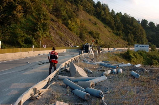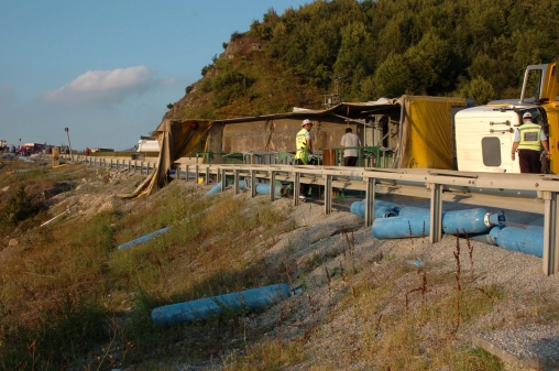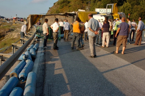 Kaza, önceki gün 18.30 sıralarında, D-100 Karayolu Bolu Dağı geçişinin Bakacak mevkiinde meydana geldi. Ankara'dan İstanbul istikametine giden olan 43 yaşındaki Selahattin Hancı'nın kullandığı 1H07 424 yabancı plakalı oksijen tüpü yüklü TIR, sürücüsünün virajda direksiyon hakimiyetini kaybetmesi sonucu bariyerlere çarparak devrildi. TIR'ın dorsesinden çevreye yayılan oksijen tüpleri sızıntı yaparken, onlarca tüp uçurumdan yuvarlandı. Kaza nedeniyle D-100 Karayolu'nun İstanbul istikameti ulaşıma kapatıldı. Trafik ekipleri, İstanbul istikametine giden araçları Elmalık kavşağından TEM Otoyolu'na yönlendirdi. Yolda kalan araçlar ise trafiğe kapalı yolda ilerledikten sonra kavşaktan çıkıp TEM Otoyolu'na yöneldi.