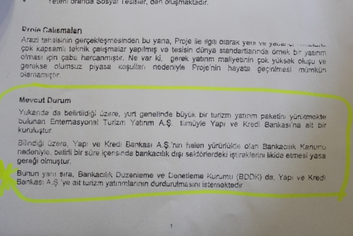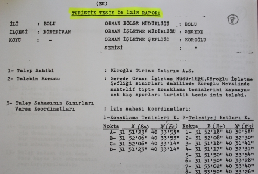 “…Yapı Kredi Bankası A.Ş. yönetimi tarafından uluslar arası bir şirket ile anlaşma yapılarak tüm bu mevcut işletmeler ve sürmekte olan yatırım projeleri için yurt içi ve yurt dışından yatırımcılar aranması istenmiştir. Böylelikle ülke ve yöre ekonomisi için büyük önem taşıyan bu yatırımların gecikmeden tamamlanarak işletmeye açılmaları ve milli ekonomiye katkıda bulunmaları amaçlanmaktadır. Bu kapsamda “Köroğlu Mountain Resort- yaz ve Kış Sporları Merkezi” projesinden vazgeçilerek, proje alanının Orman bakanlığına iadesi zorunluluğu doğmuştur.”
