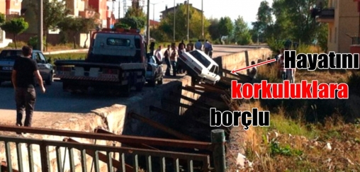 Kaza, öğle saatlerinde deri sanayisine giden ana yol üzerinde meydana geldi. İbrahim Ö. idaresindeki 14 DH 526 plakalı otomobil, sürücüsünün direksiyon hakimiyetini kaybetmesi sonucu yoldan çıktı. Yolun sağında bulunan su kanalının betonundan aşağı sallanan otomobil, demir korkulukların üzerinde asılı kaldı. Demir korkuluklar üzerinde yan duran otomobilin sürücüsü hemen araçtan çıktı. Kazayı yara almadan atlatan İbrahim Ö, demir korkuluklar sayesinde uçuruma yuvarlanmaktan kurtulduğunu söyledi.