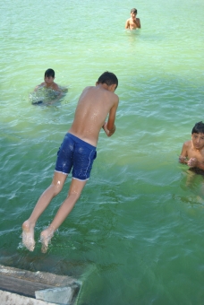 Yaklaşık bir buçuk metre derinlikteki havuza atlayışlar gerçekleştiren minikler, dakikalarca yüzüyor, doğa harikası alanda birlikte oyunlar oynuyor.