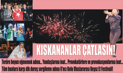 Bolu’nun tanıtımına milyonlarca liralık katkı sağlayan festivalde sahneye çıkarak, binlerce Boluluya seslenen Belediye Başkanı Alaaddin Yılmaz, “Ülkemiz sıkıntılı bir dönemden geçiyor, istenmeyen olaylar oluyor. Bu provokatör oyunlara karşı dim dik ayakta durabilmek ve onların oyunlarına gelmemek için normal hayatımızı devam ettirmek durumundayız. Biz buna inandık. Eğer bu festivali iptal etseydik onların istediği noktada davranmış olacaktık. Şehrimizde de bu işleri provoke etmek isteyenler var. Ama biz bütün bu engellemelere karşı dim dik ayakta olduğumuzu göstermek için buradayız” dedi. Yılmaz’ın alkış alan bu konuşmaları sonrası meydanda toplanan binler, ünlü sunucu Vatan Şaşmaz eşliğinde; “Kıskananlar çatlasın” sloganları attı.