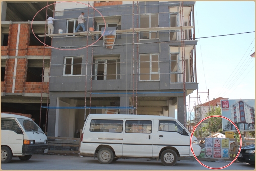 Borazanlar Mahallesi, Refika Baysal Toplum Sağlığı Merkezi yanında bulunan bir inşaatta çalışan inşaat işçileri, ölüme meydan okuyorlar. İşçiler, binanın dış cephe çalışmaları sırasında, kurulan iskele üzerinde hiçbir güvenlik önlemi almadan çalışmaya devam ederken, çalıştıkları bölümün altında ki uyarı levhalarıyla da tezat bir görüntü oluşturuyor.