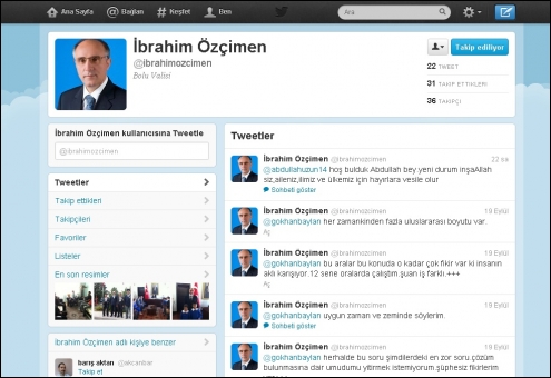 Valinin 36 takipçisi bulunuyor. Özçimen’in yanı sıra Bolu Valiliği adına da bir tweetter hesabı açıldı.
