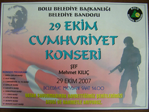 Cumhuriyetimizin ilan edilişinin 84.yılı kutlama etkinlikleri kapsamında Bolu Belediye Başkanlığı Belediye Bandosu konser verecek. Bolu Belediye Başkanlığı Belediye Bandosu, Şef Mehmet Kılıç yönetiminde 29 Ekim 2007 Pazartesi günü saat 14.00?de Belediye Meydanı?nda bir konser verecek. Bursa Işıklar Marşı, Alay Marşı, Cumhuriyetin 10. yıl Marşı, Gençlik Marşı, Sakarya Marşı, Dumlupınar Marşı, 1. Ordu Marşı, Gölcük Marşı, Selimiye Marşı ve Muhafız Alayı Marşı?nı seslendirecek olan Belediye Bandosu?nun konserine tüm halkımız davetlidir.