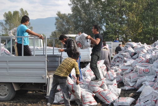 İhtiyaç sahibi aileler, kendileri için ayrılan hane başına iki buçuk tonluk kömürleri beraberinde getirdikleri kamyonlara yüklüyorlar ve ardından yardım aldıklarını gösteren evraklara imza atarak depodan ayrılıyorlar.