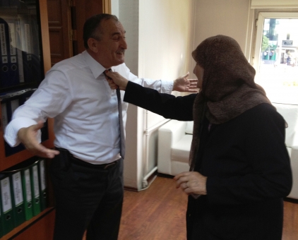 Borazanlar Mahallesi Fevzi Bey Sokak’ta devam eden yol genişletme çalışmaları sırasında meyve ağaçları çalışmaların ortasında kaldı. Fevzi Bey Sokak’ta bulunan bir evde eşiyle birlikte yaşayan Emine Demir (78) isimli kadın, belediye ekiplerinin meyve ağaçlarını kesebileceğini düşünerek soluğu belediye başkanı Alaaddin Yılmaz’ın makamında aldı. Özel kalem odasında beklerken, Alaaddin Yılmaz’ın makamından çıktığını gören kadın ayağa kalktı. Yılmaz’ın yanına giden Emine Demir, başkanı kravatından tutarak, “Evimin önünde çalışma yapılıyor. Ne olur o meyve ağaçlarını kesmesinler. Hatta söktürmek bile istemiyorum” dedi. Başkan Yılmaz da kollarını iki yana açıp yaşlı kadının isteğine yanıt vererek, “Siz hiç merak etmeyin. Söz veriyorum. Meyve ağaçlarına dokunulmayacak” dedi.