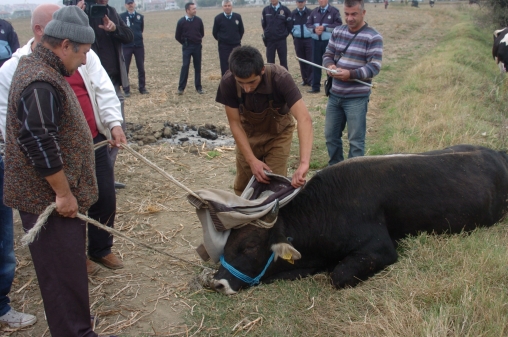 Ekiplerin müdahalesine rağmen kızgınlığı geçmeyen boğa koşmaya devam etti. Polis ve zabıta ekiplerinin araçlarla peşine düştüğü boğa, 4 kilometre koşup Çıkınlar Mahallesi’nde büyükbaş hayvanların otladığı tarlaya girdi. Polis ekipleri Belediye Veteriner İşleri Müdürlüğünden yardım isterken, tarlaya gelen görevliler boğaya bayıltıcı iğne attı. 3 iğnenin ardından bayılan boğa hemen bir ağaca bağlandı.