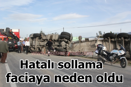 Bolu’dan Mudurnu yönüne istikamet eden bir TIR, bugün saat 14.45 civarında devrildi. Görgü tanıklarının ifadesine göre; aynı istikamette seyreden 14 plakalı, kırmızı bir araç tarafından hatalı şekilde sollandı. Kırmızı araç, karşıdan bir araç gelmesi nedeniyle aniden TIR’ın önüne geçti. TIR Şoförü Ahmet B. direksiyon hâkimiyetini kaybederek yolda ters döndü. Şoför mahalinin bulunduğu yöne devrilen araçta sıkışan Ahmet B. Bolu İtfaiye ekipleri tarafından kurtarılarak Abant İzzet Baysal Üniversitesi Tıp Fakültesi Hastanesine sevk edildi.