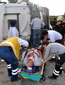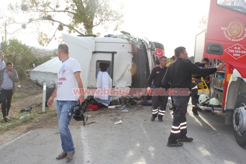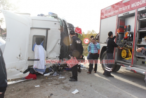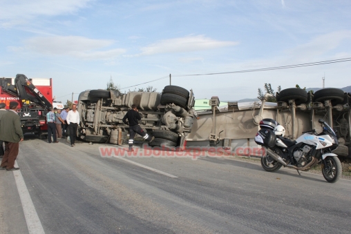Bolu’dan Mudurnu yönüne istikamet eden bir TIR, dün saat 14.45 civarında devrildi. Görgü tanıklarının ifadesine göre; aynı istikamette seyreden 14 plakalı, kırmızı bir araç tarafından hatalı şekilde sollandı. Kırmızı araç, karşıdan bir araç gelmesi nedeniyle aniden TIR’ın önüne geçti. TIR Şoförü Ahmet B. direksiyon hâkimiyetini kaybederek yolda ters döndü. Şoför mahalinin bulunduğu yöne devrilen araçta sıkışan Ahmet B. Bolu İtfaiye ekipleri tarafından kurtarılarak Abant İzzet Baysal Üniversitesi Tıp Fakültesi Hastanesine sevk edildi.