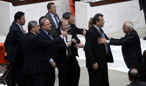Saralı ve MHP'lileri araya gerin milletvekilleri durdurdu. Sözlü tartışmanın devam etmesi nedeniyle Başkanvekili Sağlam oturuma ara verdi. Aranın ardından kürsüye gelen MHP Grup Başkanvekili Oktay Vural, AK Partili Saral'a cevap vererek, "10 yıldan fazladır hükümetsiniz. Bize ilişkin bir şey yapmadıysanız, bu sizi bağlar. Ne biliyorsan getir, neyin varsa getir. Biz buraya Allaha şükrederek geldik. Recep Tayyip Erdoğan'a şükür namazı kılarak değil" dedi.