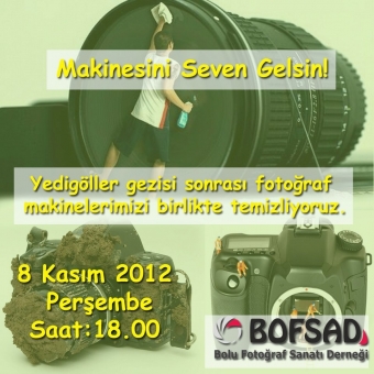 Bolu Fotoğraf Sanatı Derneği üyeleri her hafta gerçekleştirdikleri Perşembe sohbetlerinde, bu hafta Fotoğraf Makinelerini temizleyecekler. 4 Kasım Cuma günü, 165 kişinin katılımıyla gerçekleşen Yedigöller gezisi sonrası yapımına karar verilen etkinlikte, her arazi çalışmasından sonra yapılması önerilen “fotoğraf makinesi temizliği” ile ilgili bilgiler verilecek. “Makinesini seven gelsin” sloganı ile duyurulan etkinlik için muhabirimize bilgi veren BOFSAD Yönetim Kurulu “Özellikle arazi çekimlerinde fotoğraf makinemizin parçaları ve çeşitli yüzeyleri toz, çamur, su gibi kirleticilere maruz kalmaktadır. Bu kirleticiler hem makinemize zarar vermekte hem de bir sonraki çekimde fotoğraflarda istenmeyen sonuçların oluşmasına neden olmaktadır. Bu hafta perşembe sohbetimizde hep birlikte makinemizi temizleyecek, makine üzerinde dokunulması ve dokunulmaması gereken yüzeyler hakkında bilgi edineceğiz. ” açıklamasında bulundular.