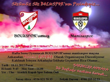 Ankaralı Yarenler taraftar grubunun sosyal paylaşım sitesinde yaptığı açıklamaya göre her hafta olduğu gibi Boluspor-Manisaspor karşılaşmasına Ankara'dan organizasyon gerçekleşecek. Otobüsün maç günü saat 09.45'de Ulus Atatürk Spor Salonu önünden kalkacağı öğrenildi. Alınan bilgiye göre Bolu’ya kalkacak otobüslerde yer almak isteyen taraftarlar geliş-gidiş için yalnızca 10 TL. ödeyerek maçın heyecanına ortak olabilecekler. Otobüs organizasyonu için Savaş Akça (0 536 8215835) ve Selçuk Dursun’a (0 536 821 58 35) ulaşılması gerekiyor. Konuyla ilgili olarak Ankaralı Yarenler tarafından yapılan kısa açıklamada, “Arma uğruna yollardayız. Bir başkadır uzaktan sevmek” ifadelerine yer verildi.