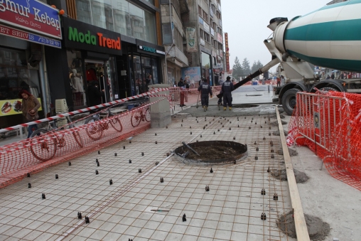 İzzet Baysal Caddesi’nde başlatılan düzenleme çalışmaları aralıksız sürerken, çalışmalar kapsamında doğal görünümlü baskı beton çalışmaları da start aldı. Cadde üzerine dökülen 10 santimetrelik beton uygulaması tamamlandıktan sonra, 15 santimetre daha yükseltiliyor. Daha sonra üzerine uygulama yapılarak özel bir malzeme ile kaplanıyor. Ardından baskı beton dökülerek şekillendiriliyor. Kentte devam eden baskı beton çalışmalarının kış öncesi tamamlanması bekleniyor.