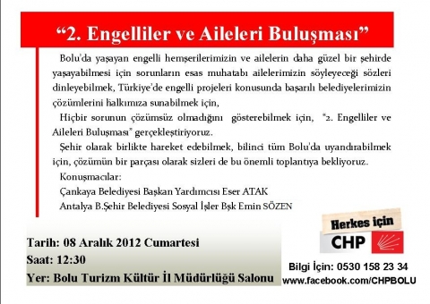 8 Aralık Cumartesi günü gerçekleştirilecek olan “2’nci Engelli ve Aileleri Buluşması” için ziyaretler, İnşaat Mühendisleri Odası, Makina Mühendisleri Odası, Türk-İş, ÇYDD, ADD, Rehabilitasyon Merkezleri ve çeşitli kuruluşlar ile devam etti.