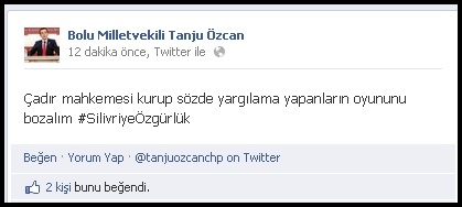 Tanju Özcan, duruşma sırasında sosyal paylaşım sitesi twitterdan düşüncelerini şöyle paylaştı: “Çadır mahkemesi kurup sözde yargılama yapanların oyununu bozalım”