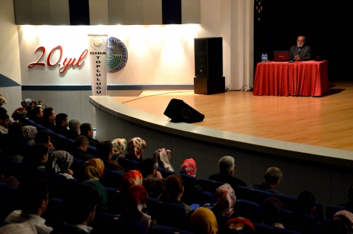 Kültür Merkezi Mavi Salon’da düzenlenen “Helal Gıda” konulu konferansa, Gıda ve İhtiyaç Maddeleri Denetleme ve Sertifikalama Araştırmaları Derneği (GİMDES) Başkanı Dr. Hüseyin Kami Büyüközer konuşmacı olarak katıldı. Dr. Büyüközer, helal gıdanın sadece temizlik ve hijyene uygunlukla sınırlı olmadığını, aynı zamanda gıdaların Kur’an ve Hadisler çerçevesindeki İslami kurallara da uygunluğu içermesi gerektiğini anlattı.