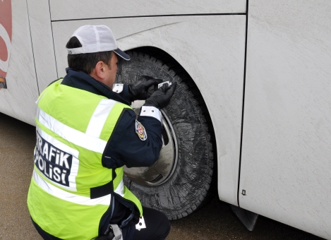 Türkiye’nin önemli geçiş güzergahlarından biri olan Bolu Dağı’nda yoğun kar yağışı sonrası yaşanan otobüs kazaları emniyeti harekete geçirdi. Bolu İl Emniyet Müdürlüğü Trafik Şube Müdürlüğü ekipler, Bolu Şehirlerarası Otobüs Terminali’nde öğle saatlerinde uygulama yaptı. Yolcu otobüslerini tek tek durduran trafik ekipleri, kar lastiği, zincir, takoz ve çekme halatlarını kontrol etti. Ekipler ayrıca, kumpas adı verilen ölçüm aletiyle lastiklerin diş boyunu ölçtü. Polislerin kontrolü sırasında otobüslerde bulunan yolcular da gazete okuyarak uygulamanın bitmesini bekledi.