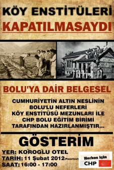 Cumhuriyet Halk Partisi Bolu Merkez İlçe teşkilatı, siyasi partilerin önemli işlerinden biri olduğunu niteledikleri sosyal sorumluluk projelerine bir yenisini ekledi. Köy Enstitülerinin kapatılışının 59. Yılı dolayısıyla hazırlanan belgeselde Bolulu mezunlar ve çocuklarının döneme dair bilgi paylaşımları yer alıyor. Çarşamba günü parti binasında düzenlenen toplantı ile basına tanıtımı yapılan belgesel ile ilgili konuşma yapan Merkez İlçe Başkanı Faruk İyigün “İsmet İnönü, Hasan Ali Yücel, İsmail Hakkı Tonguç ve birçok memleket sevdalısı insanın önderliğinde kurulan köy enstitüleri, döneminde ve sonrasında dünyaya örnek olan bir proje olarak gelişim gösterirken, başta Demokrat Parti ve bazı odaklar tarafından mesnetsiz suçlamalarla 27 Ocak 1954’de kapatılmıştır” dedi.
