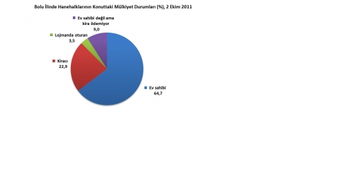 “Ülkemizde Hane halklarının yüzde 21,8’i 10 ve daha az yaştaki binalardaki konutlarda yaşamaktadır. Bolu ilinde hane halklarının yüzde 26,2’si 10 ve daha az yaştaki binalardaki konutlarda yaşamaktadır. Ülkemizde Hane halklarının yüzde 67,3’ü kendi konutunda oturmaktadır. Bolu ilinde ikamet ettikleri konutta kiracı olan hane halklarının oranı yüzde 22,9, ev sahibi olanların oranı yüzde 64,7, ev sahibi değil ama kira ödemeyenlerin oranı yüzde 9,0 ve ikamet ettiği yer lojman olanların oranı yüzde 3,5’tir.”