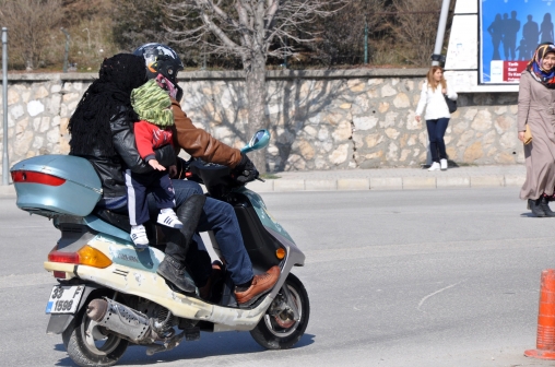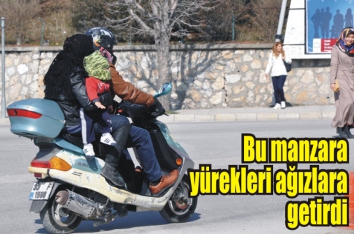 Yurdun çeşitli bölgelerinde trafik kazalarının yüzde 80’inin sürücü hatalarından kaynaklandığı tespit edilirken, Bolu’da objektiflere yansıyan görüntü ise dikkatsizlik ve vurdumduymazlığı bir kez daha gözler önüne serdi. Paşaköy’den İsmet Paşa Caddesi’ne seyreden bir motosiklete üç kişi binen aile, yürekleri ağza getirdi. Motoru kullanan kocasının arkasına binen kadın, bir eliyle eşine tutunurken, diğer eliyle de kucağına aldığı çocuğunu taşımaya çalıştı. Ayakları boşta sallanan minik çocuğu görenler korku dolu anlar yaşarken, tek eliyle çocuğunu tutmaya çalışan annenin vurdumduymazlığı bu kadar da olmaz dedirtti.