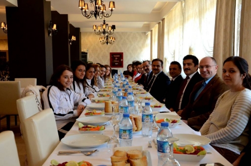 Sosyal Tesis’teki yemeğe Rektör Prof. Dr. Hayri Coşkun’un yanı sıra Rektör Yardımcıları Prof. Dr. Kenan Gümüştekin ve Prof. Dr. Cabir Terzioğlu, Genel Sekreter Doç. Dr. Erdal Bekiroğlu, AİBÜ Spor Kulübü üyesi ve BESYO Müdürü Yrd. Doç. Dr. Ümit Karlı, AİBÜ Spor Kulübü Başkanı ve Antrenörlük Eğitimi Bölümü öğretim üyesi Yrd. Doç. Dr. Yılmaz Uçan, AİBÜ Spor Kulübü Antrenörü Yasin Yükseler ile Bayan Hokey Takımı katıldı. Rektör Prof. Dr. Coşkun, elde ettiği Avrupa Şampiyonluğu ile üniversitenin ismini dünyaya duyuran takımı ve yöneticileri bir kez daha kutladı. AİBÜ Rektörlüğü, AİBÜ Spor Kulübü Bayan Hokey Takımı oyuncularına, hayırsever işadamı Orhan Uçar’ın sponsorluğunda çeyrek altın ve hediye takdim etti. Avrupa Şampiyonu oyuncular, üniversite yönetimi ile hatıra fotoğrafı çektirdi.
