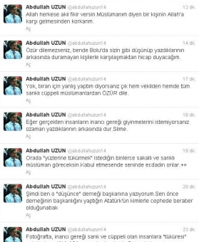 Abdullah Uzun, “Bolu'da sözüm ona ‘Düşünce’ derneği başkanı bir fotoğrafa yorum yapmış. Milletin vekiline ve Millet'e ‘tükürmek’ istemiş. Fotoğrafta, inancı gereği sarık ve cüppeli olan insanlara ‘tüküresi’ gelmiş. Ama, tükürüğüme yazık olur demiş. Sonrada bu yorumunu silmiş. Şimdi ben o ‘düşünce’ derneği başkanına yazıyorum. Sen önce derneğinin başkanlığını yaptığın Atatürk'ün kimlerle cephede beraber olduğuna bak. Orada ‘yüzlerine tükürmek’ istediğin binlerce sakallı ve sarıklı Müslüman göreceksin. Kabul etmesen de seninde ecdadın onlar. Eğer gerçekten insanların inancı gereği giyinmelerini istemiyorsanız o zaman yazdıklarının arkasında dur. Silme. Yok, biran için yanlış yaptım diyorsanız çık hem vekilden hem de tüm sarıklı cüppeli Müslümanlardan ÖZÜR dile. Özür dilemezseniz, bende Bolu'da sizin gibi düşünüp yazdıklarının arkasında duramayan kişilerle karşılaşmaktan hicap duyacağım. Allah herkese akıl fikir versin. Müslüman’ım diyen bir kişinin Allah'a karşı gelmesinden korkarım” ifadelerine yer verdi.