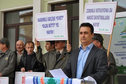 Ellerinde pankart ve dövizlerle atama kararını protesto eden Orman Muhafaza Memurları adına TOÇ Bir Sen Bolu Şube Başkanı Ramazan Doğan konuşma yaptı. Doğan, “Kurum için bu denli önemli bir yönetmeliğin çıkarılmasında Orman ve Su İşleri Bakanlığı ve Orman Genel Müdürlüğü, yönetmelik yayımlamadan her yıl gerçekleştirilen Kurum İdare Kurullarında: Yetkili Sendika TOÇ BİR-SEN’ ile almış olduğu ilke kararı gereğince: Bakanlık ve Orman Genel Müdürlüğü üye ve çalışanlarımızın özlük haklarını ilgilendiren kanun, yönetmelik, genelge vb gibi her türlü mevzuat çalışmalarında, 4688 sayılı Kamu Görevlileri ve Toplu Sözleşme Kanunu, 2010/26 Başbakanlık Genelgesi ile kurumlarımızla müşterek her yıl Ekim ve Nisan aylarında yapılan Kurum İdari Kurulları Kararları gereğince yetkili sendikanın görüş ve önerilerinin dikkate alınması.’’mutabakatının gereğini yerine getirmemiş başta Toç Bir Sen olmak üzere hiçbir sosyal tarafın görüş ve önerileri alınmadan tek taraflı olarak bir oldu bitti ile çok boyutlu düşünülmeden yönetmelik yayınlanmıştır. Hatta Teftiş Kurulu’nun, Bölge Müdürlüklerinin, Daire Başkanlıklarının, İşletme Müdürlüklerinin, Sivil Toplum Kuruluşlarının görüş ve önerileri alınmadan, apar topar Ramazan Bayramı öncesi yangından mal kaçırırcasına yönetmelik yayınlanması, kurumu ve çalışanları zor durumda bırakmıştır. Böyle bir uygulamanın binlerce Orman Muhafaza Memurumuzu aynı anda çalışma yerlerinden koparmak eğitim gören çocuklarını okullarından söküp almak kurumumuza, ülkemize bir yarar getirmeyeceği gibi alınan karar nedeniyle çalışanlarımızın moral ve motivasyonu bozulmuş, hata sıfırlanmış bu da kuşkusuz ki iş verimliliğinin düşmesine neden olmuştur. Ülkemizin en önemli kurumlarından biri olan Orman ve Su İşleri Bakanlığı ile Orman Genel Müdürlüğünün, sosyal tarafların görüş ve önerilerini dikkate almadan ortaya koyduğu bu Oldu-Bitti Yönetmeliğin yeni düzenleme yapılmadan uygulamaya konulmasının kabul edilebilir bir yanı yoktur” dedi.