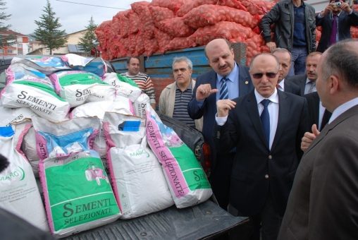 Vali Özçimen'in konuşmasının ardından 143 bin kilogram Agria patates tohumluğu ile 15 bin kilogram yonca tohumu dağıtımı yapıldı. Vali İbrahim Özçimen, Milletvekili Ali Ercoşkun ve Ak Parti İl Başkanı Ömer Sayın, sertifikalı patates tohumluğunu alan vatandaşların patates çuvalını ucundan tutarak traktöre yüklemesine yardımcı oldu.