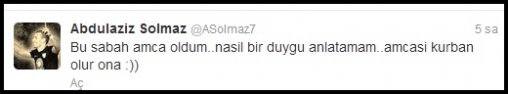 Kırmızı Beyazlı ekibin başarılı futbolcularından Abdülaziz Solmaz, dün sabah amca olma mutluluğunu yaşadı. Ligin 25. Haftasında Konya Torku Spor karşısında ki tek golü kaydeden ve takımımıza altın değerinde üç puanı kazandıran Solmaz, twitterdan amca olduğu haberini paylaştı. Solmaz iletisinde “Bu sabah amca oldum. Nasıl bir duygu anlatamam. Amcası kurban olur ona” cümleleriyle mutluluğunu dile getirdi.