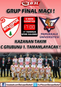 C Grubu’nda lider durumda bulunan temsilcimiz Boluspor Basketbol Takımı grubun son maçında 2.durumda bulunan Pamukkale Üniversitesi’ni konuk edecek. 13 Nisan Cumartesi günü saat 17.00’de 17 Temmuz Spor Salonu’nda oynanacak olan maçı kazanan taraf grup şampiyonu olarak 2.lige yükselme maçlarına katılmaya hak kazanacak. Devlerimiz zorlu randevuda taraftarının da desteği galip gelerek şampiyonluğa ulaşmak istiyor.