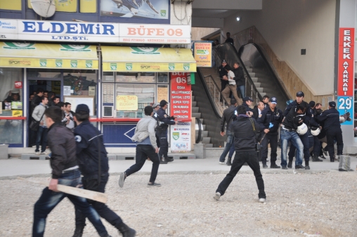 İnşaat malzemesi olarak kullanılan demir çubuklar ve kalıp tahtalarıyla birbirlerine saldıran iki işçi grubu Belediye Meydanı’nda savaş alanlarını andıran görüntülerin yaşanmasına neden oldu.
