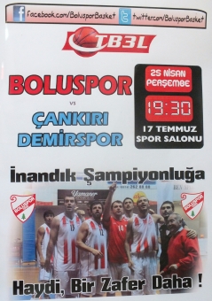 Çankırı Spor Salonu'nda oynanan serinin ilk maçını 73-64 kazanan temsilcimiz bu akşam oynanacak olan rövanş maçından da seyircisinin de desteği ile galip ayrılmak istiyor.İki galibiyet alan takımın tur atlayacağı play-off serisinin ikinci maçı bu akşam saat 19.30’da 17 Temmuz Spor Salonu’nda oynanacak. Boluspor Basketbol Takımı bu maçı da kazanırsa play-off serisinde finale yükselecek, Boluspor finalde rakibini elemesi durumunda Türkiye Basketbol 2. Ligine yükselecek olan 3 takım arasından birisi olmak için 6 takımın yer alacağı grupta mücadele edecek.