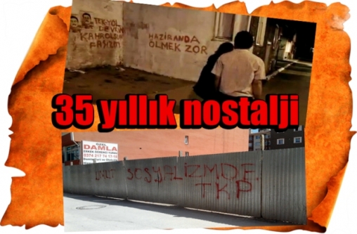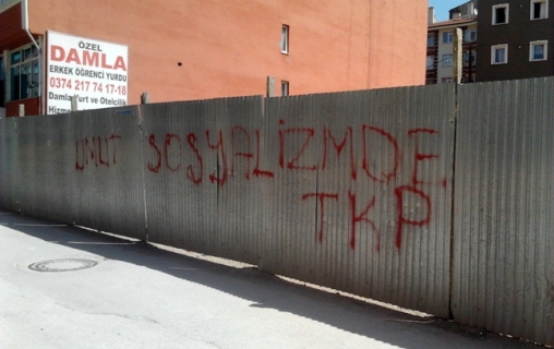 Türkiye Komünist Partisi eski usul propaganda anlayışından vazgeçmemiş görünüyor. Kimliği belli olmayan bir grup Türkiye Komünist Partili gencin, dün Ferit Talay Caddesi üzerinde bulunan koruma amaçlı konulan çinko levhanın üzerine “Umut Sosyalizmde” yazdıkları görüldü. Sprey boyayla yazılan yazının altına da TKP ibaresi konulurken, kırmızı boyayla çinko duvara yazılan yazı 1980 öncesi Türkiye’sini hatırlattı.