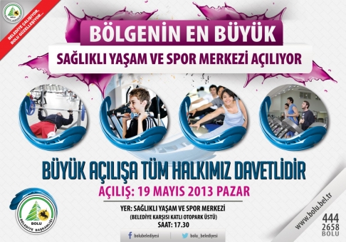 Geçmişte Bolu’nun tek katlı otoparkı olarak kullanılan ve Bolu Belediyesi tarafından yeniden düzenlenerek en üst katına bölgenin en büyük spor merkezi olarak inşa edilen ‘Bolu Belediyesi Sağlıklı Yaşam Merkezi’nin resmi açılış töreni yapılıyor. 1000 m2 fitness salonu, 500 m2 kafeterya alanı, 150 ve 120 m2 iki adet halk oyunları, Latin dansları, plates, bale, Uzakdoğu sporlarının yapılacağı özel oda, 300 m2 asma kat, bay ve bayan soyunma odaları, bay ve bayan ayrı olmak üzere 9 adet banyo, 3 adet tuvaletten oluşan ve toplamda 2 bin m2 alana sahip merkezin açılış töreni 19 Mayıs 2013 Pazar günü saat 17.30’da gerçekleştirilecek.