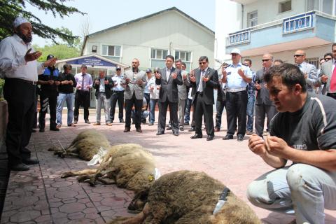 İki ayda yaklaşık 10 aracın kaza yapması sonrası memurların can ve mal güvenliği için, Küçük Sanayi Sitesinde bulunan Yıldırım Ekipler Amirliği önünde, Cuma namazı öncesi 3 tane kurban kesildi.
