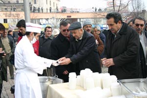 Cuma Namazı çıkışı Büyük Camii ve Belediye önünde dağıtımı yapılan aşureyi vatandaşlara ikram eden Belediye Başkanı Alaaddin Yılmaz burada yaptığı konuşmada; ?Aşure bizim kültürümüzde, bilhassa dinimizde en önemli yeri olan bir yemektir. Biz, bu geleneklerimizi devam ettirmek zorundayız. Şu anda Hayır Çarşımız 5 bin kişilik aşure yemeğini dağıtıyor. Geleneklerimizi daimi hale getirmek durumundayız. Geleneklerimizle geleceğe yürümek durumundayız. Bu konuda ilk yaptığımız çalışmalarda vatandaşlarımız memnun kaldılar. Aynı çalışmalara devam ediyoruz. Vatandaşlarımızın istekleri devam ettikçe de bizim çalışmalarımız devam edecektir? dedi.