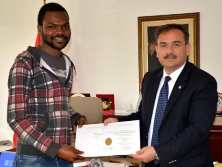 2009 yılından bu yana AİBÜ Fen Edebiyat Fakültesi Fizik Bölümü’nde öğrenim gören ve bu yıl mezun olmaya hak kazanan Nijeryalı Abdulsalam Aji Suleiman’a diplomasını, Prof. Dr. Hayri Coşkun Rektörlük makamında takdim etti.