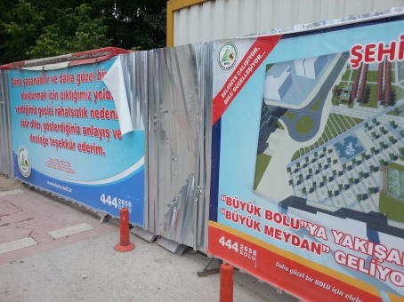 Önceki gün gece yarısı başlayan ve sabahın ilk ışıklarına dek süren olaylardan biri de Bolu Belediyesi’nin yayalaştırma çalışmalarını sürdürdüğü Kent Meydanı alanında meydana geldi. Sayıları yaklaşık 300’ü bulduğu bildirilen kalabalık grup, olaylarda, proje çalışmalarını yürüten şantiyeyi bastı. Kent Meydanı’na giriş yapmak isteyen grup, bölgenin sac levhalarla çevrili olması nedeniyle başarısız olunca, çevredeki Bolu Belediyesi amblemlerini ve afişlerini söktü, bölgeyi çevreleyen sac levhaları yumrukladı. Sabahın ilk ışıklarına dek süren olaylar sonrası gündüz saatlerinde bölgede karşılaşılan manzara korkunçtu. Olaylara ev sahipliği yapan bölgeye giden Bolu Express Gazetesi Haber Merkezi, Kent Meydanı Projesi çalışmalarının yürütüldüğü bölgenin son halini görüntüledi, çalışmaları yürüten müteahhit firma yetkilileriyle görüştü.